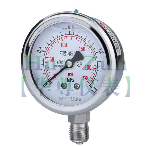 4、應(yīng)根據(jù)鍋爐工作壓力來選擇,量程刻度的極限值應(yīng)為工作壓力的1.5~3.0倍,zui好是2倍。在工業(yè)鍋爐中,實際情況是鍋爐實際運行時的工作壓力總是比銘牌上的額定壓力要低,工業(yè)蒸汽鍋爐和熱水采暖鍋爐均是如此。例如4t/h的蒸汽鍋爐,額定壓力為1MPa,制造廠如按1.5倍來配備壓力表,應(yīng)配備1.6MPa量程壓力表。若用戶由于生產(chǎn)工藝需要,實際運行在0.5MPa壓力下即能滿足工藝要求,這時運行量程,壓力表的指針就指在量程的三分之一不到的位置,指針轉(zhuǎn)過角度很小.即選用的壓力表量程太大。 熱水鍋爐也是如此,例如采暖鍋爐額定壓力為0.7MPa,配備壓力表應(yīng)為1MPa或1.6MPa,如配備1MPa的壓力表,怕在水壓試驗時使壓力表過載,于是便配備量程為1.6MPa的壓力表。實際運行時,只要0.2MPa就能滿足采暖要求,壓力表的指針指在量程八分之一的位置,很難使人相信壓力表的準(zhǔn)確性和靈敏性。